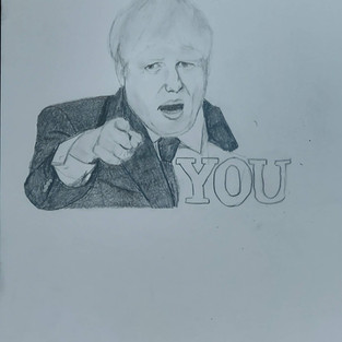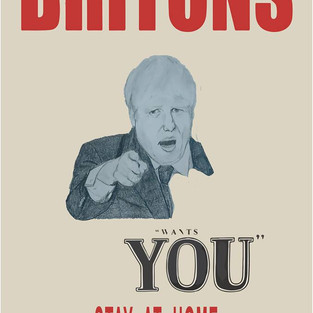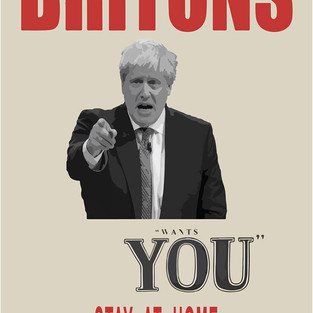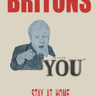 Lucy-Eve Wright also collaborated with me on these posers by using my ideas in a digital format. She used both my drawing and photographs to experiment with different styles. Originally she used my drawing however I felt this didn't work against the digital text even with the 'YOU' was moved up to fit in with the drawing. For the photographs I think the most successful ones are the one where Johnson is pointing directly forward and the one where he has his hand on his head. I think the latter one works particularly well with the phase 'GOD I DIDN'T SIGN UP TO THIS'. I think these poster could be developed by fitting the 'YOU' in with the image like in the original poster. We also experimented with using Boris rather than Britons. I think this works when making a comment about the Prime Minister but not in sharing the message of staying at home to the public.